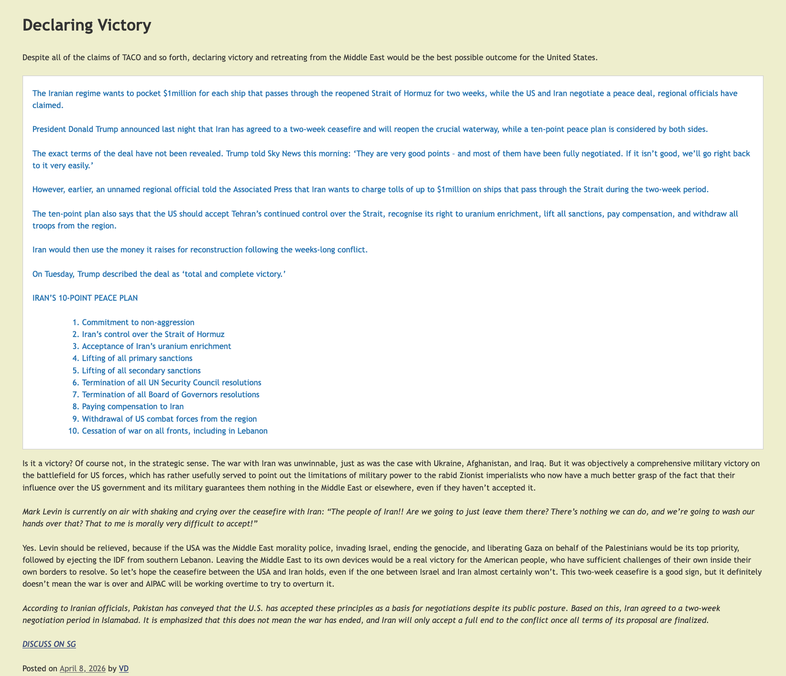 Trump just used this two weeks as a cooling off period--and when it's up, we will sluff off some excuse and then go home. Afterwards Iran will resume with fervor it's ballistic missile program and put the Shahid drones back into production at 500 per day. Also, I bet they'll get real busy enriching their uranium--as they would be stupid not to. On top of this they should approach Russia for a few batteries of their Oresnik missiles systems--talk about a game changer that would be. The ability to level, with precision anything up to a couple thousand miles away. You can be during this two week period that Russia and China will be pumping in mass stockpiles of AAA manpads and other needed goodies. I don't think Iran is going to be fooled anymore by American diplomacy.