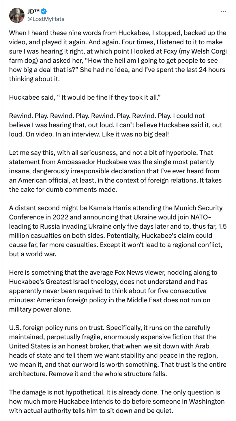 Mainstream reporting from The Times of Israel and other diplomatic-focused outlets characterized his comments as a move toward a "might makes right" foreign policy. This is seen as a radical departure for a U.S. Ambassador, as it ignores international law and decades of U.S.-led peace negotiations based on "land for peace" frameworks. Realizing the potential fallout, Huckabee later characterized his "take it all" and related defense comments as "somewhat hyperbolic". However, media coverage suggests the damage was already done, with the "Irish defense" analogy remaining a primary point of criticism for its lack of diplomatic foresight. Mainstream media analysts and critics noted that Mike Huckabee’s arguments regarding religious and cultural ties to land created a "rhetorical trap" with significant implications for U.S. domestic policy.